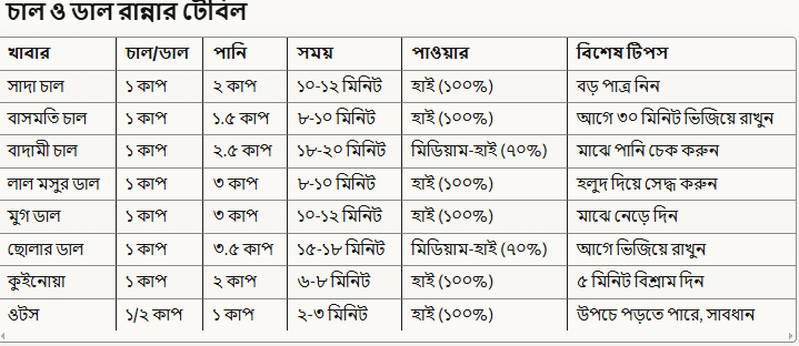 - ১ কাপ চাল: ১০-১২ মিনিট, হাই পাওয়ার