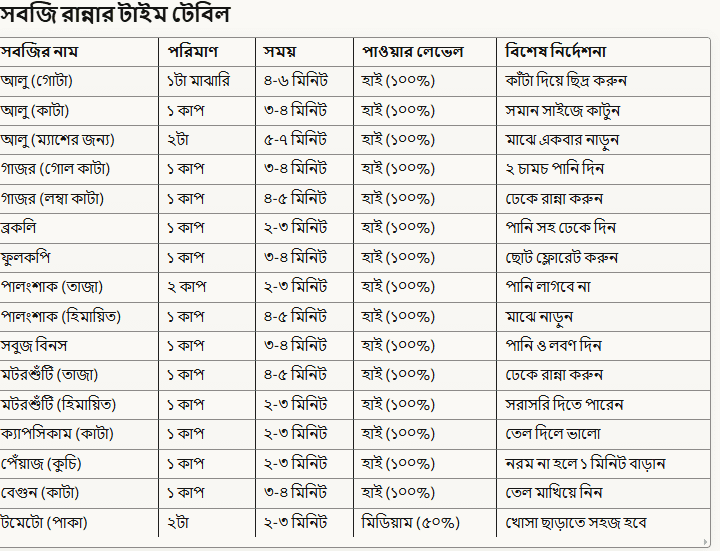 - হিমায়িত সবজি (২ কাপ): ৪-৫ মিনিট