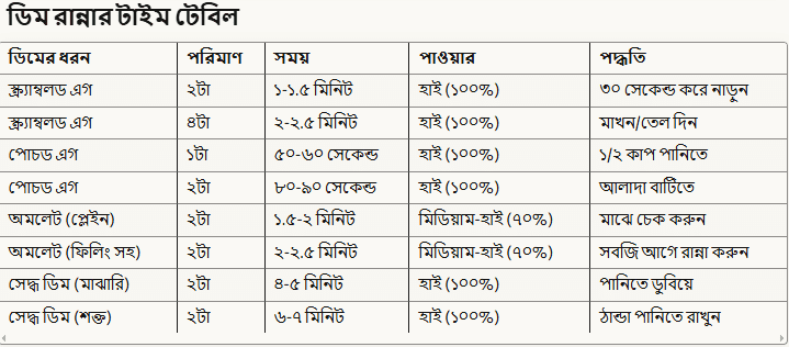 - ১টা ডিম: ৫০-৬০ সেকেন্ড, হাই পাওয়ার