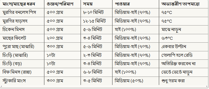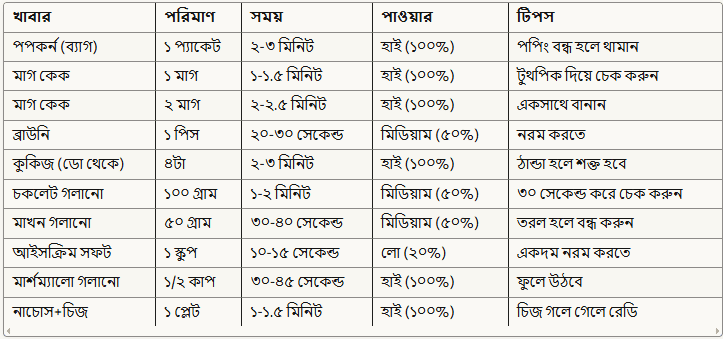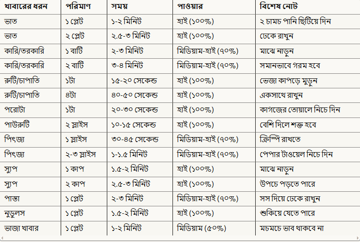 এই মাইক্রোওয়েভ কুকিং টাইম চার্ট আপনার রান্নাকে সহজ করবে। বিদেশে একা থাকলে এই চার্ট প্রিন্ট করে ফ্রিজে লাগিয়ে রাখতে পারেন। প্রতিবার গুগল করার দরকার হবে না।