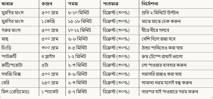 - মুরগি (৫০০ গ্রাম): ৮-১০ মিনিট, ডিফ্রস্ট মোড