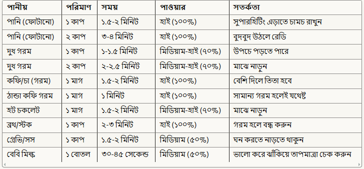 - ১ কাপ দুধ: ১-১.৫ মিনিট, মিডিয়াম-হাই