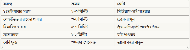 - ১ কাপ: ১.৫-২ মিনিট, হাই পাওয়ার