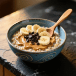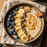 Maple cinnamon oatmeal bowl topped with banana, blueberries, and walnuts in ceramic bowl.